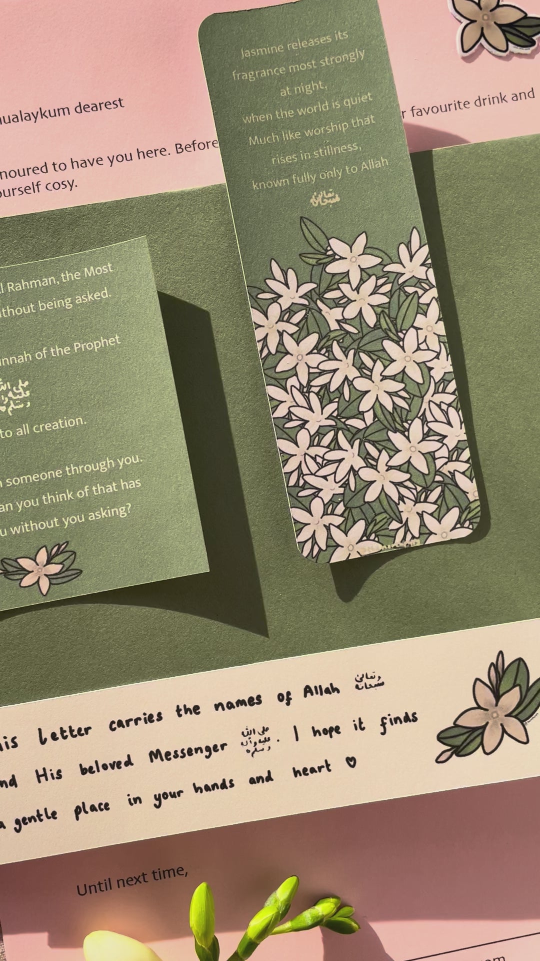 February’s Mail Club is full of quiet moments. Mercy, Al Rahman, soft rain, and the first hints of Ramadan. The floral focus for February is Jasmine.